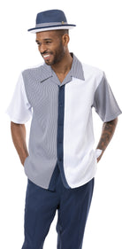 Navy Houndstooth Vertical Color Block Walking Suit 2 Piece Short Sleeve Set 2211