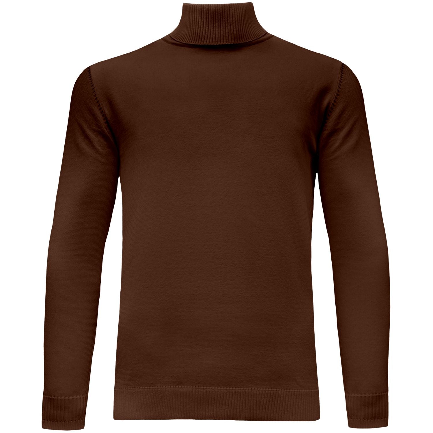 Long-sleeve knit turtleneck in brown with a clean, minimal front. Soft stretch knit with ribbed neck, cuffs, and hem for a secure, comfortable fit. From Bagazio.