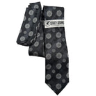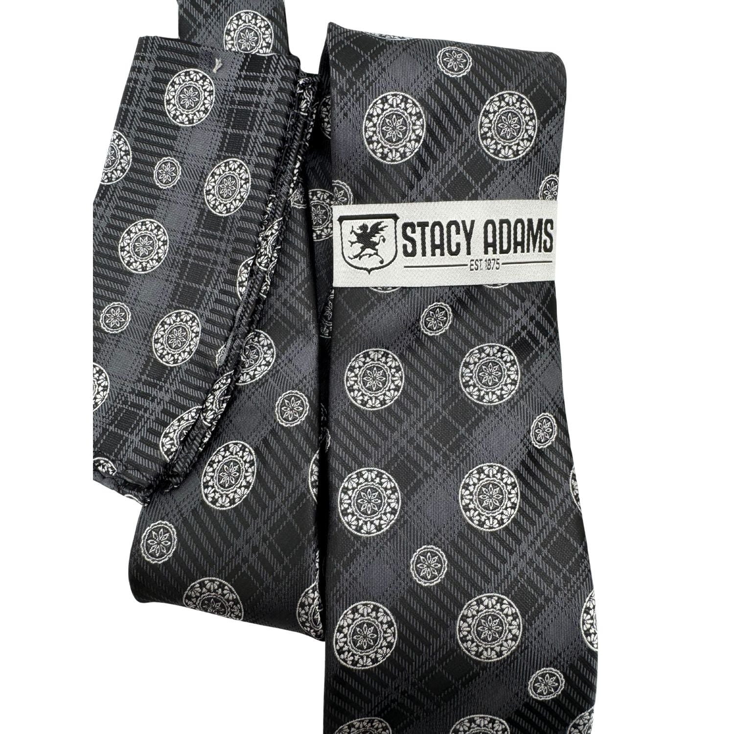 Master the art of understated elegance with the Nocturne Collection by Stacy Adams. This meticulously designed set features a deep charcoal and black plaid base, providing a structured, heritage-inspired foundation. Floating across this architectural backdrop are intricate, silver-white circular medallions that offer a refined visual rhythm, ensuring your formal ensemble feels both grounded and distinctively modern.