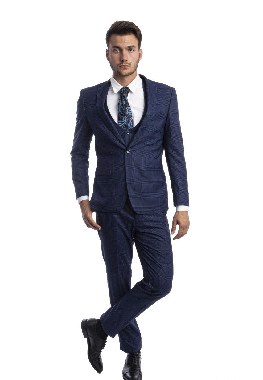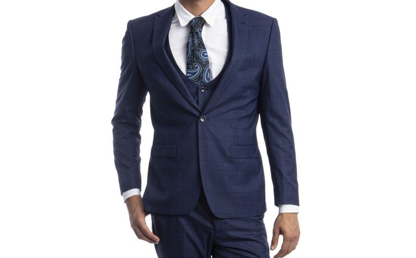 The Olympus Lux Collection presents the Blue Glen Check Three-Piece Suit, tailored for the modern man seeking a blend of classic style and contemporary fit. This ultra slim suit features a one-button peak lapel jacket, a matching four-button vest, and sleek flat-front pants, all adorned with a sophisticated blue Glen Check pattern. Designed for versatility and style, this suit ensures you look polished at any formal or business occasion.
