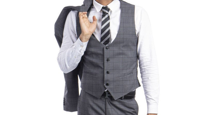 The Olympus Lux Gray Glen Check Three-Piece Suit epitomizes the fusion of traditional aesthetics and sleek modern tailoring. This suit includes an ultra slim fit jacket with a chic one-button peak lapel, a complementary four-button vest, and flat-front pants, all featuring a refined gray Glen Check. It's an ideal choice for professional settings or elegant social events, providing a sharp, sophisticated look.