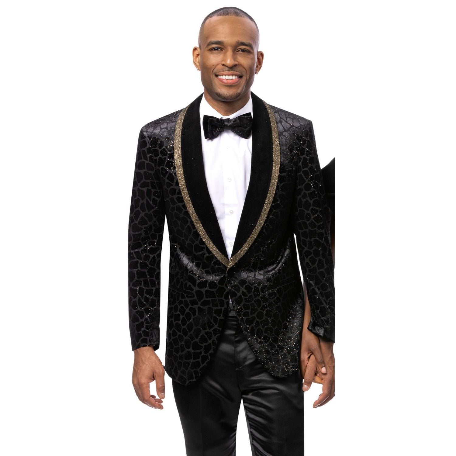 Step into a world of elegance with our Black and Gold Velvet Blazer. Perfect for formal events and celebrations, this blazer features a striking black and gold pattern that ensures you stand out. The luxurious black velvet lapel adds a rich texture contrast, making it a wardrobe essential for the discerning gentleman.