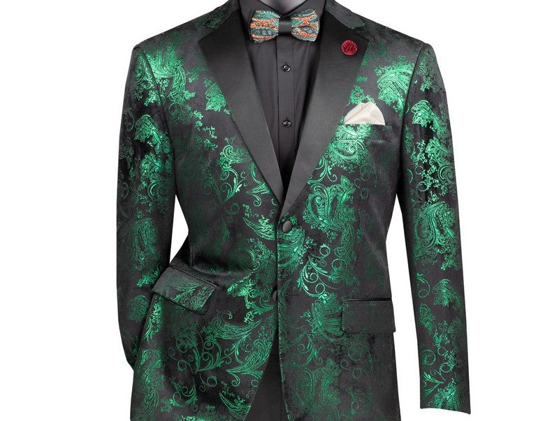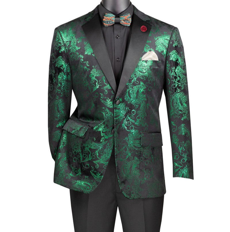 Orionis Collection: Emerald Paisley Embossed Satin Peak Lapel Velvet Blazer – Modern Fit