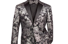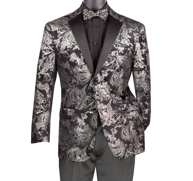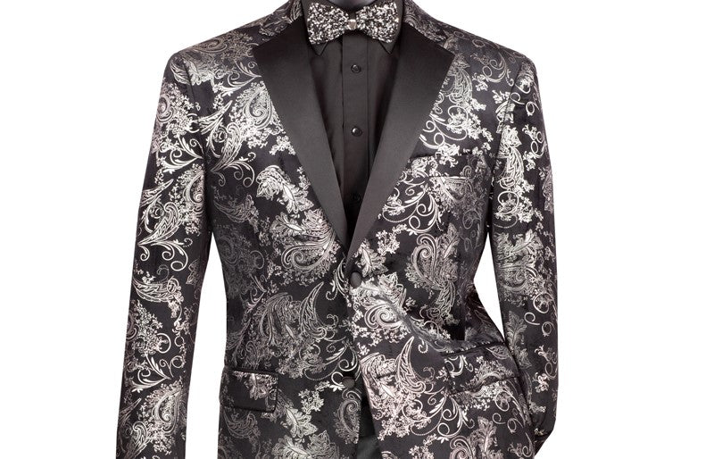 For a sleek and modern look, the Orionis Collection Silver & Black Paisley Embossed Velvet Blazer delivers the perfect balance of elegance and flair. The silver-on-black embossed paisley velvet creates a refined aesthetic, complemented by a satin peak lapel and structured modern fit. Ideal for upscale occasions and formal celebrations.