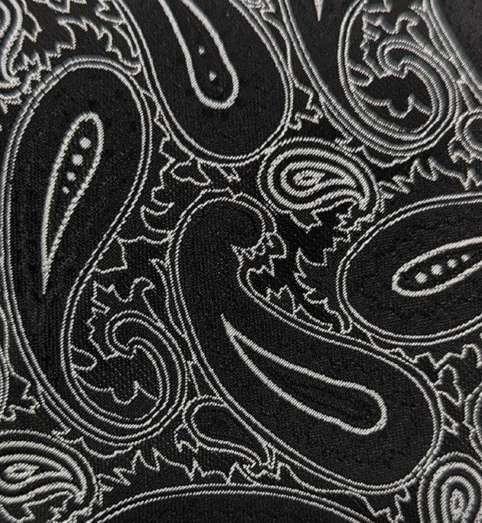 Introducing the Paisley Prestige Collection Black and Silver Paisley Tie, a sartorial masterpiece designed for the modern gentleman. This tie, crafted with 1200 needle refined polyester, offers a luxurious feel and superior durability. The intricate Black and Silver paisley pattern is not just a style statement but a testament to timeless elegance. Perfect for any occasion, from boardroom meetings to wedding receptions, this tie ensures you carry a piece of classic sophistication wherever you go.