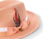 From the Cetus Collection, this peach fedora hat by Montique is a perfect blend of elegance and versatility. Its finely woven crown and 2 1/2" brim provide a balanced and stylish silhouette, while the two-tone grosgrain ribbon band in peach and white adds a refined touch. A bold feather accent and the lightweight polyester blend construction make it both functional and fashionable. Designed in New Jersey and imported, this hat is ideal for both casual and formal occasions. Size XL is available for an additional $5 to ensure the perfect fit.