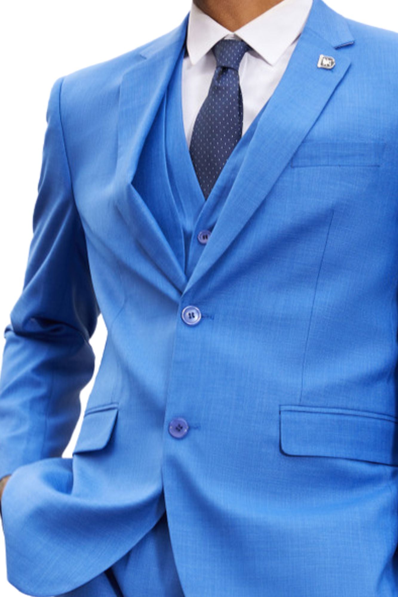 PoshPerry Collection: Men's 3 Piece Solid Textured Hybrid Fit Suit In Blue