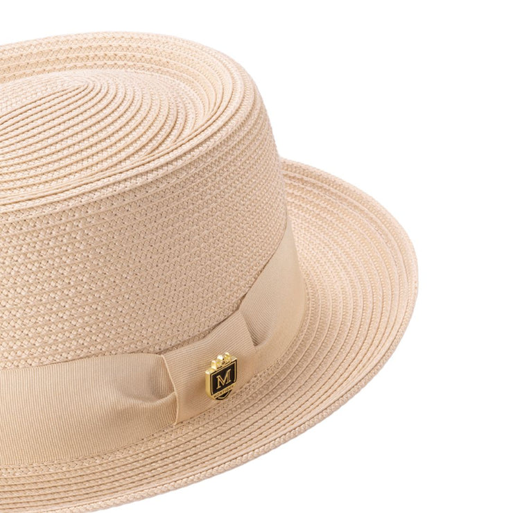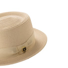 The Protostar Collection brings a fresh take on a timeless favorite. This Beige-colored pork pie hat is designed for those who appreciate understated elegance with a vintage touch. The structured yet lightweight straw-like weave offers a breathable fit, perfect for warmer days or year-round style. A matching grosgrain band with a sleek double bow gives it a polished finish, while the Montique signature crest pin adds a subtle touch of class. Whether you're stepping out for a casual afternoon or an upscale event, this hat completes the look with effortless charm.