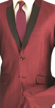 - Narrow Shawl Collar: This classic detail adds an element of finesse, harmoniously blending with the tuxedo's rich maroon tone.