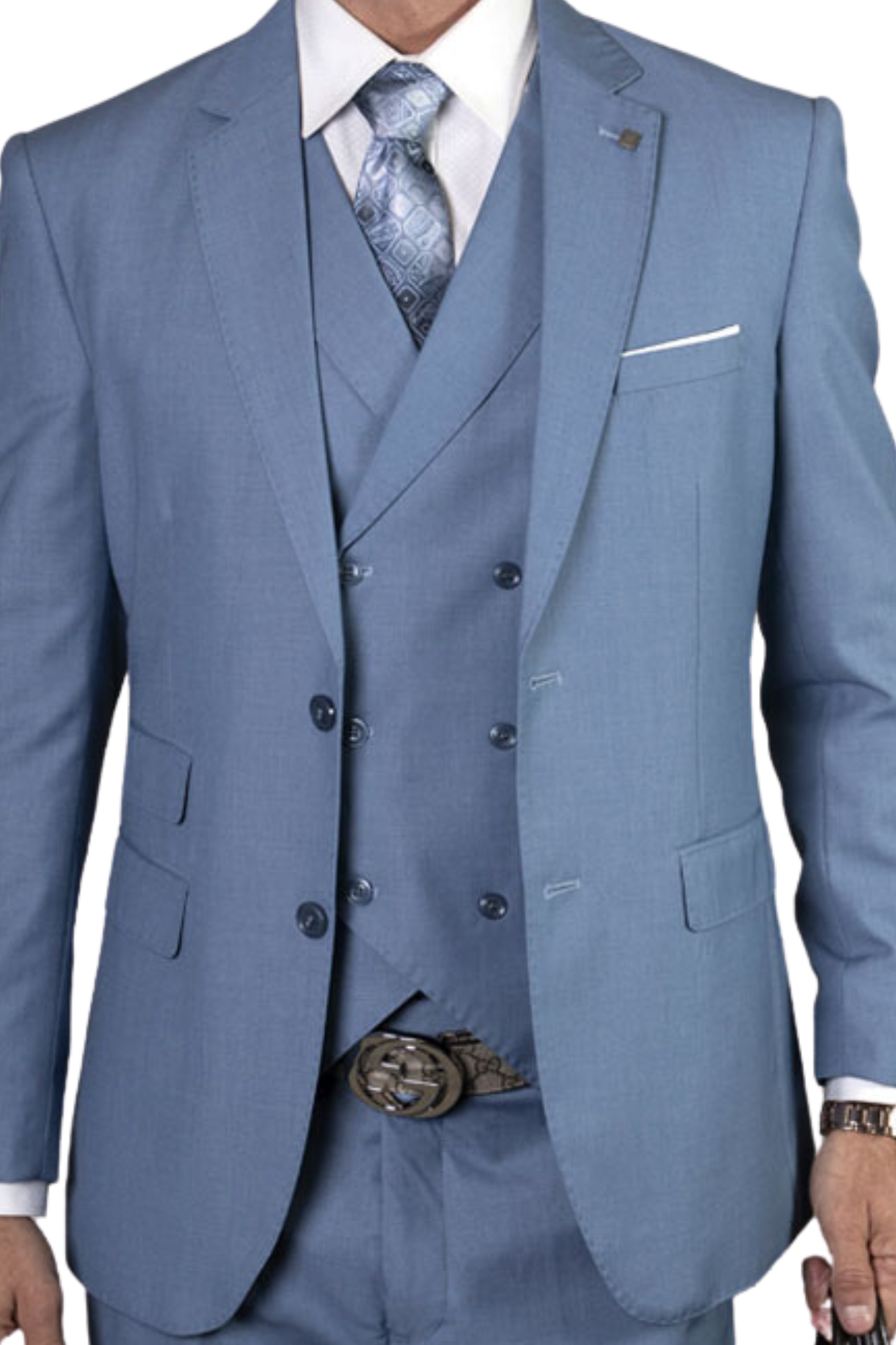 Qualitique Collection: Steel Blue 3PC Modern Fit Suit with Double Breasted Vest