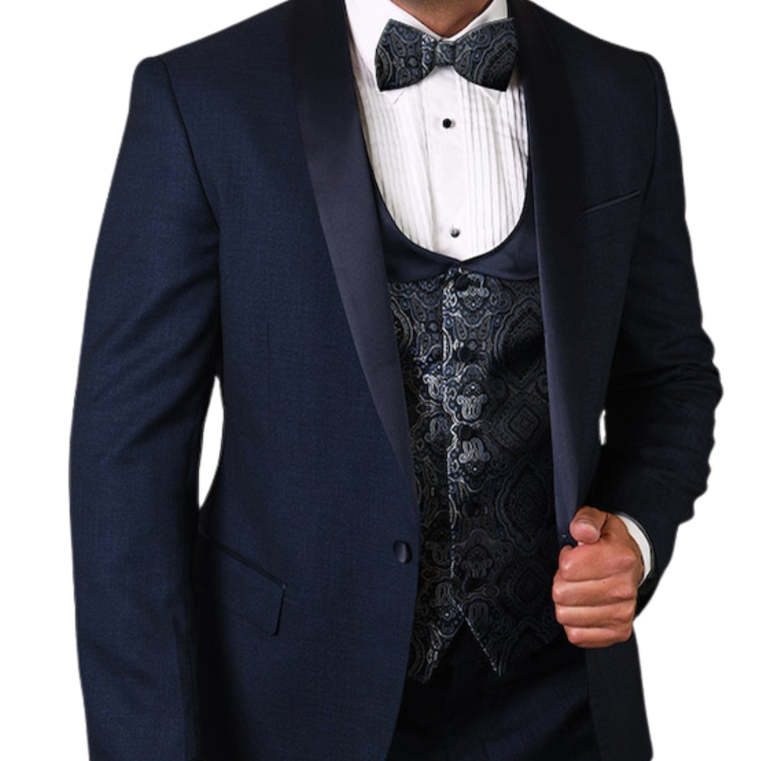 Introducing the Quantum Collection Indigo Tailored Fit Tuxedo – a distinctive choice for those special occasions that demand a touch of sophistication. This three-piece set includes a meticulously tailored jacket with two back vents for a flawless fit, flat front pants lined to the knee ensuring comfort and style, and a matching vest and bow tie to complete your elegant look.