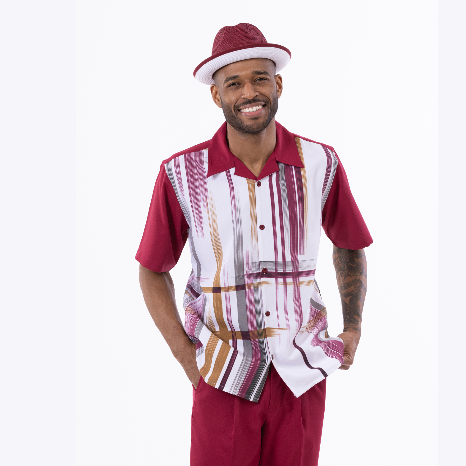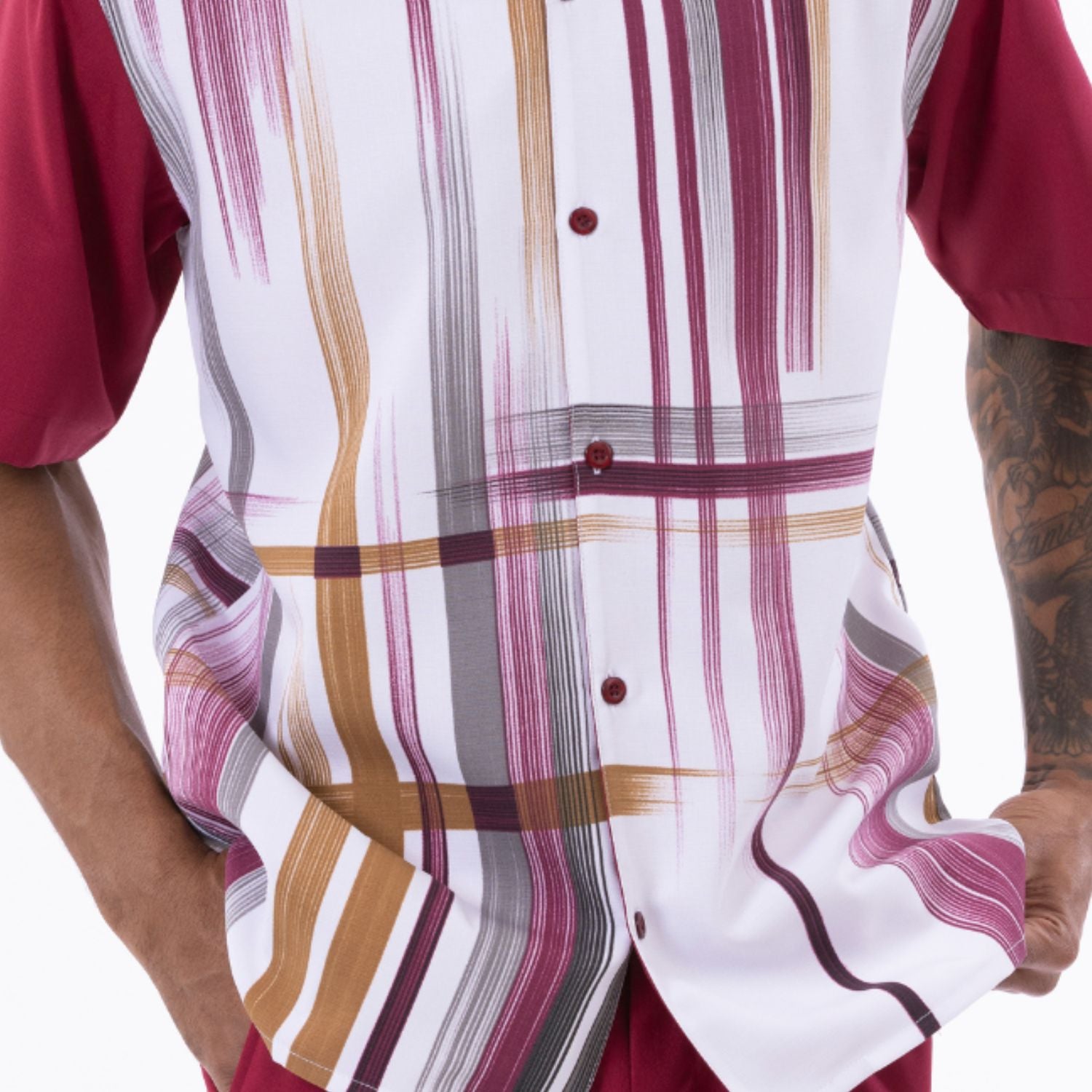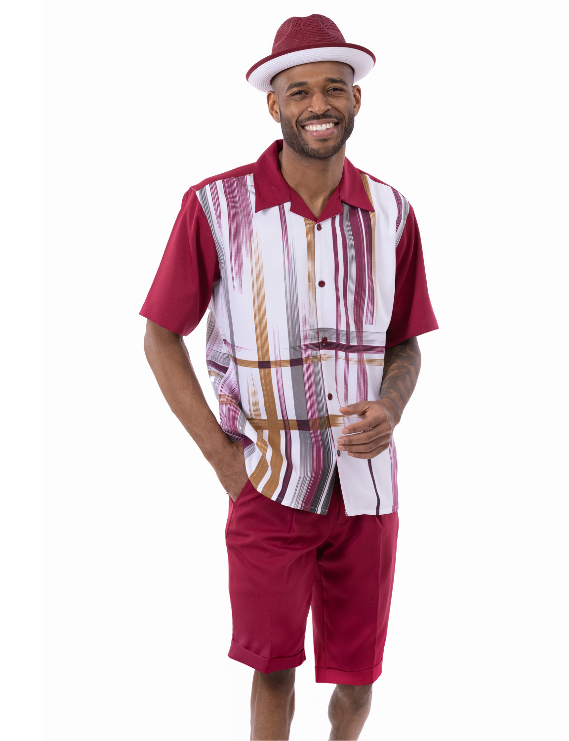 Montique Faded Vertical Stripes in Burgundy Walking Suit 2 Piece SHORTS SET 72324