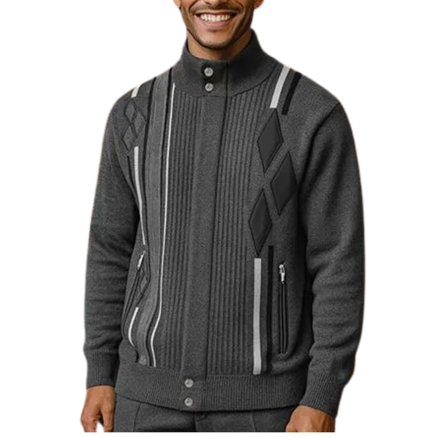 Add dimension to your wardrobe with the Rasalas Collection sweater jacket in grey. This standout piece blends modern structure with subtle luxury, featuring ribbed vertical textures and bold suede diamond argyle accents across the front. The full zip front, vertical striping, and snap-button collar give this sweater a polished, layered look that still feels easy.