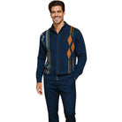 Add dimension to your wardrobe with the Rasalas Collection sweater jacket in navy. This standout piece blends modern structure with subtle luxury, featuring ribbed vertical textures and bold suede diamond argyle accents across the front. The full zip front, vertical striping, and snap-button collar give this sweater a polished, layered look that still feels easy.
