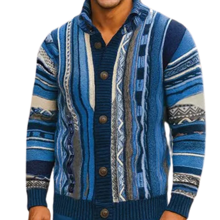 This button-up sweater features a mix of color tones in a bold, textured knit that instantly stands out. Crafted in a warm wool blend, it’s finished with ribbed cuffs, hem, and collar for comfort and structure. The button front makes it easy to layer or wear solo.