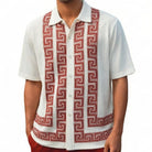 Part of the Crestview Collection, this 2-piece walking suit set includes a short sleeve button-front shirt with a Greek key knit front and matching solid pants. The front panel adds strong visual structure through repeated geometric framing, while the coordinated pants keep the set balanced and easy to wear.