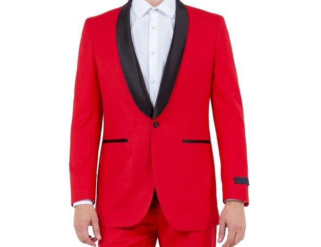 - Color: Vibrant red with a contrasting black satin shawl collar.