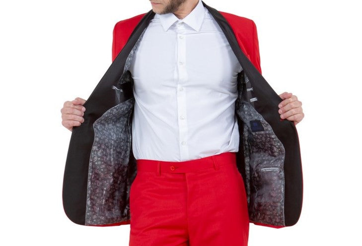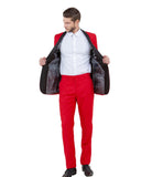 Ignite your formal wardrobe with the Regal Realm Red Tuxedo, strikingly accented with a black satin shawl collar. This bold ensemble features a one-button front closure, tailored for occasions where making a lasting impression is key. Perfect for gala events, weddings, or any formal occasion where standout style is desired, this tuxedo pairs the fiery allure of red with the refined elegance of black satin, offering a modern silhouette and an unforgettable look.
