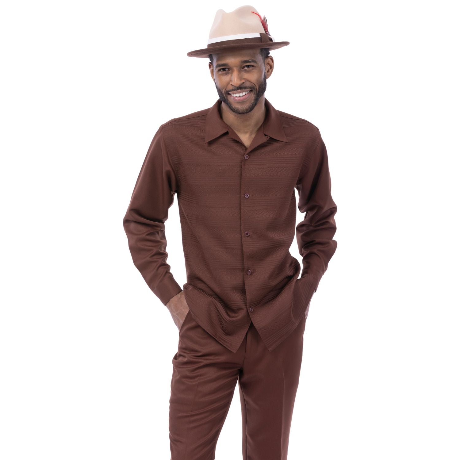 This 2-piece walking suit set includes a brown long sleeve shirt with a tone-on-tone horizontal stripe texture and a matching pair of solid brown pants. The shirt features a button front and open collar. Designed for a clean, coordinated look with subtle detailing.
