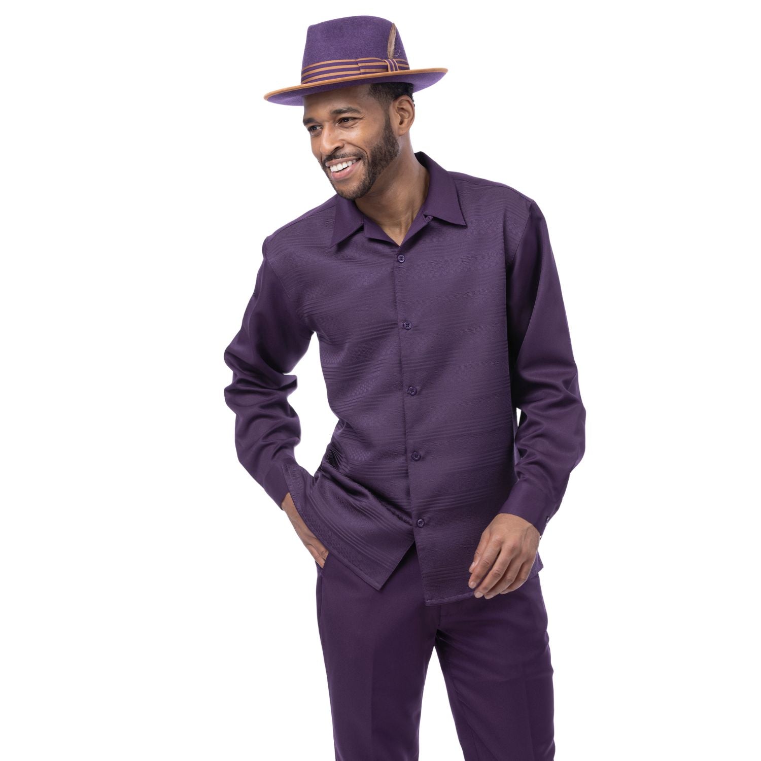 This 2-piece walking suit set includes a grape long sleeve shirt with a tone-on-tone horizontal stripe texture and a matching pair of solid grape pants. The shirt features a button front and open collar. Designed for a clean, coordinated look with subtle detailing.