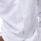 This 2-piece walking suit set includes a white long sleeve shirt with a tone-on-tone horizontal stripe texture and a matching pair of solid white pants. The shirt features a button front and open collar. Designed for a clean, coordinated look with subtle detailing.