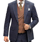 Step into the spotlight with the RegalRush Midnight Blue Plaid 3-Piece Suit, a symbol of refined taste crafted from Super 200's Italian wool and cashmere. This sophisticated ensemble features a single-breasted 1-button peak lapel jacket, which perfectly complements the solid contrasting color double-breasted vest. The deep midnight blue hue, enriched with a subtle plaid pattern, enhances the suit's overall allure. Paired with modern fit flat front pants, this suit is designed for the gentleman who values both style and comfort at formal occasions and business events.