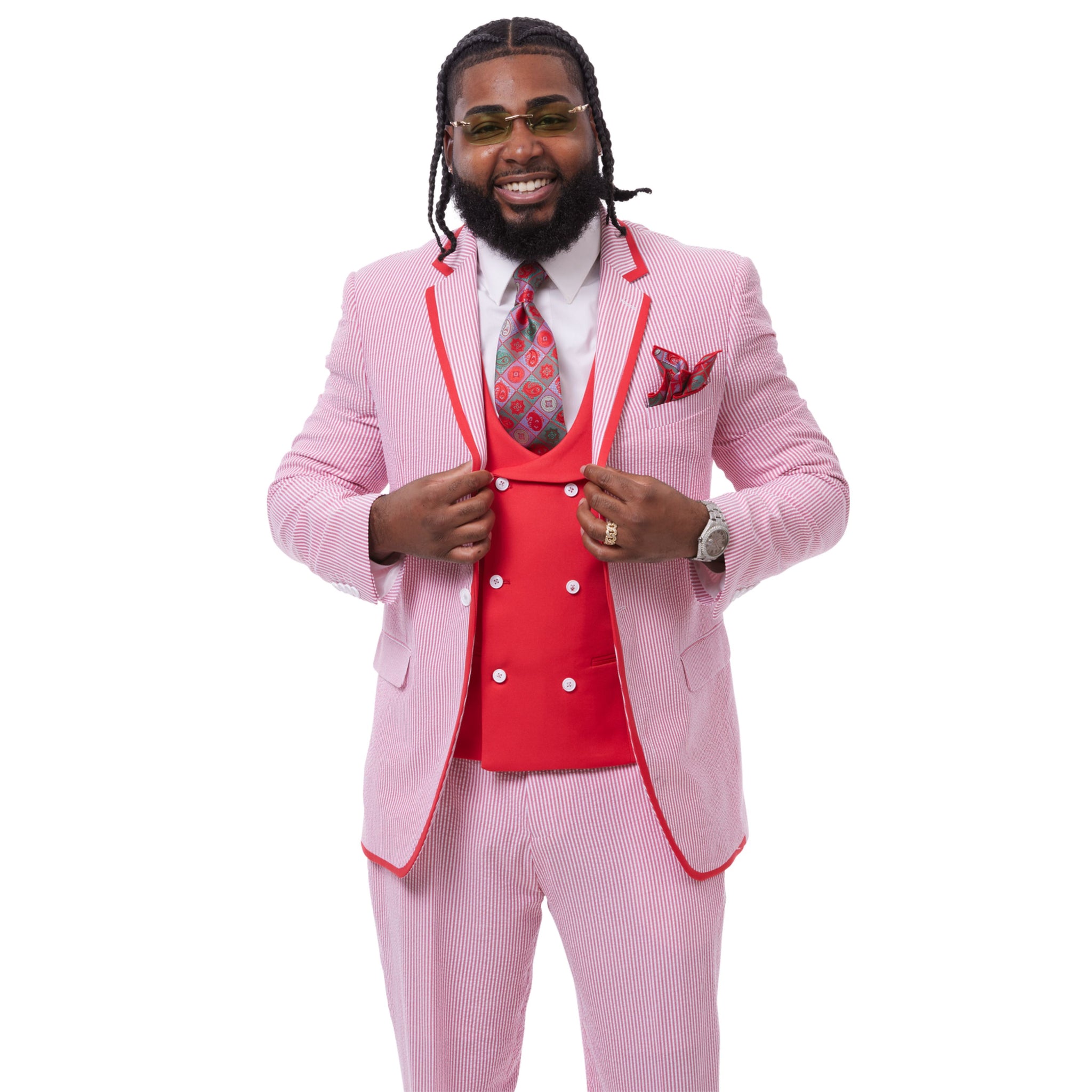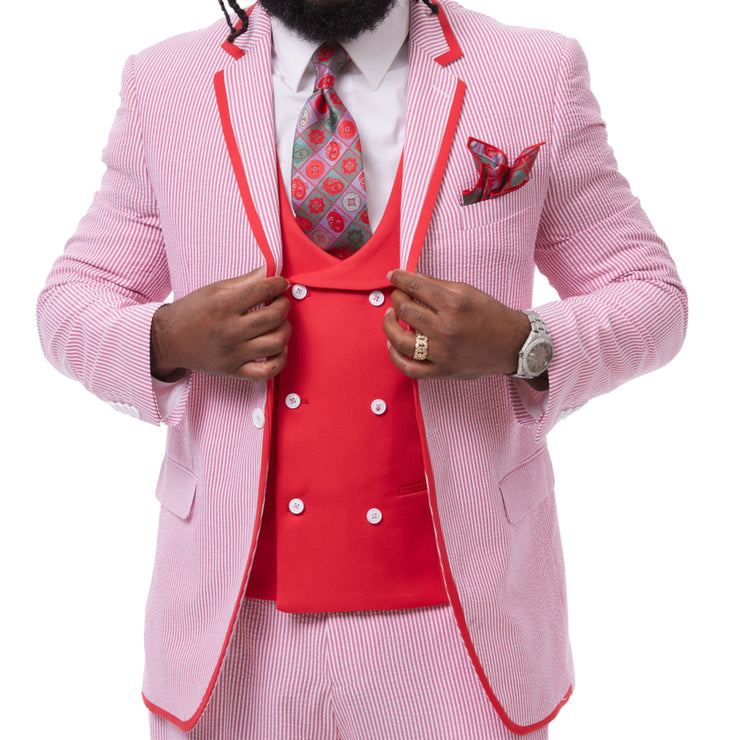 Rigant Collection: Red Seersucker 3-Piece Suit with Solid Vest and Contrast Trim