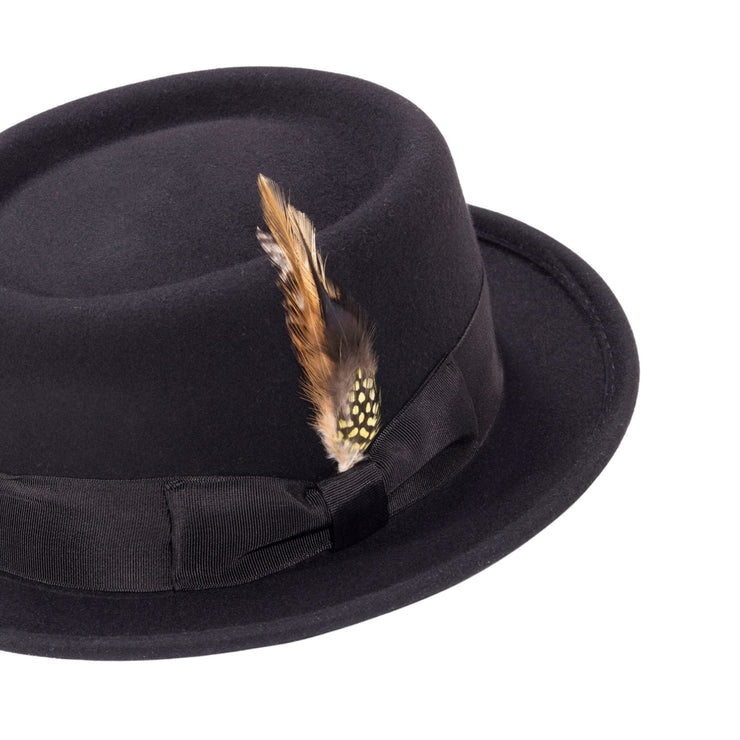 Ring Collection: Black Pork Pie Fedora with Feather Accents