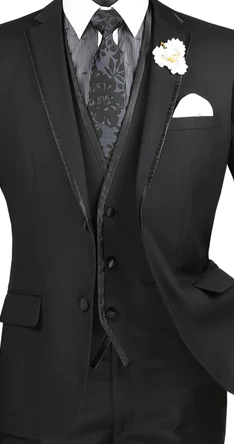 Royal Ravine Collection: Black 3 Piece Satin Trimmed Lapel Single Breasted Slim Fit Suit