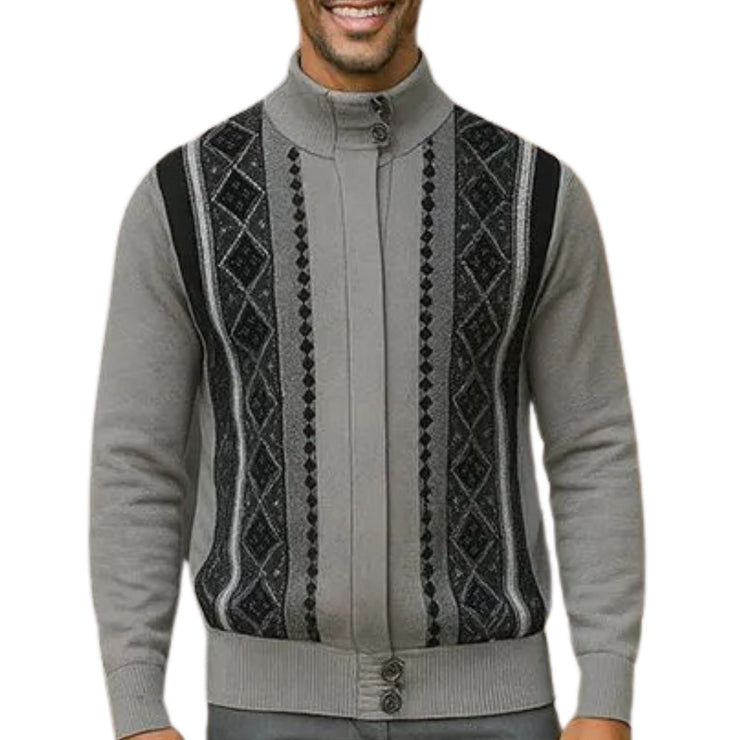 Add a bold layer without saying a word. The Solanus Collection sweater jacket in grey combines a structured fit with standout detail. Featuring a hidden zip placket and vertical knit paneling in grey and black, this piece is perfect for dressing up casual days or layering over a crisp tee for a weekend out.