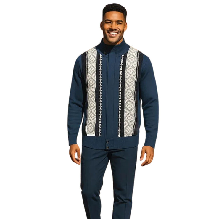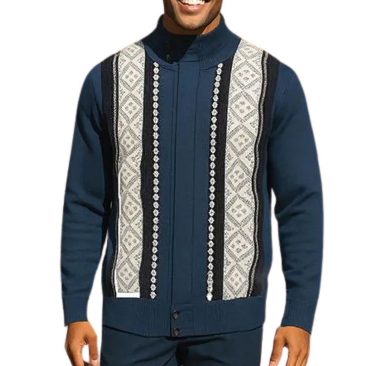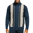 Add a bold layer without saying a word. The Solanus Collection sweater jacket in indigo combines a structured fit with standout detail. Featuring a hidden zip placket and vertical knit paneling in black and ivory, this piece is perfect for dressing up casual days or layering over a crisp tee for a weekend out.
