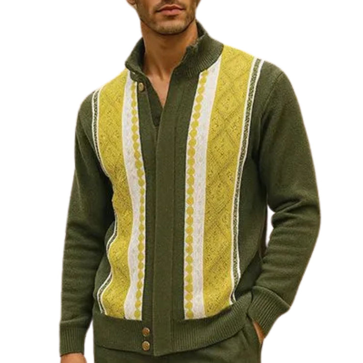 Add a bold layer without saying a word. The Solanus Collection sweater jacket in olive combines a structured fit with standout detail. Featuring a hidden zip placket and vertical knit paneling in mustard and ivory, this piece is perfect for dressing up casual days or layering over a crisp tee for a weekend out.