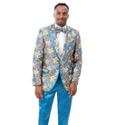 Light up the room with bold color and confidence. The Solarius Collection mixes ornate baroque florals with rich satin pants for a look that commands attention. Jacket, pants, and a matching bowtie-this set is built for high-energy celebrations and standout moments.