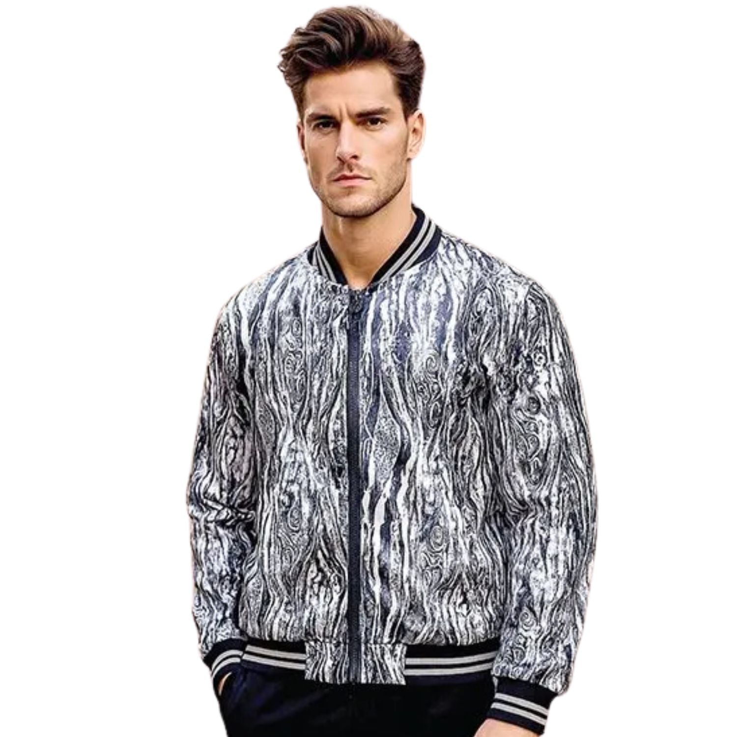 Take a bold step into standout style with this Stacy Adams zip jacket set from the Solivagus Collection. The abstract wave pattern in silvery black tones gives this jacket a statement edge, while the coordinated pants deliver all-day comfort and swagger. Perfect for dressing up your streetwear or cooling down a night out.