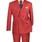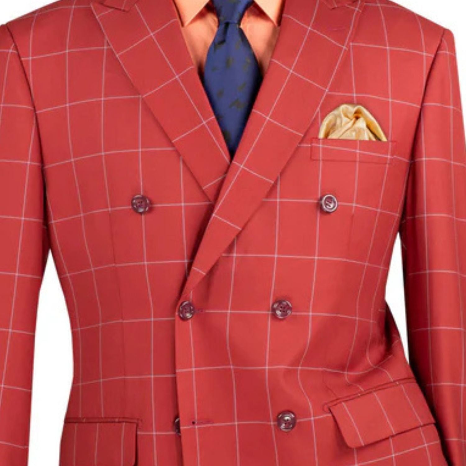Experience a touch of sophistication with the Sophistichic Collection. This modern fit, double-breasted suit in a classic apple red hue comes with stylish side vents and flat front windowpane pants, promising an ensemble that radiates finesse and luxury.