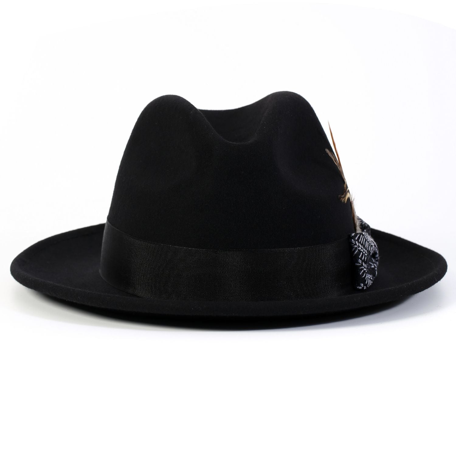 This black and white wool felt fedora delivers a sharp, structured look with bold contrast. Designed with a classic pinch crown and a 2 1/2 inch wide brim, it creates a strong silhouette that stands out while staying easy to style.