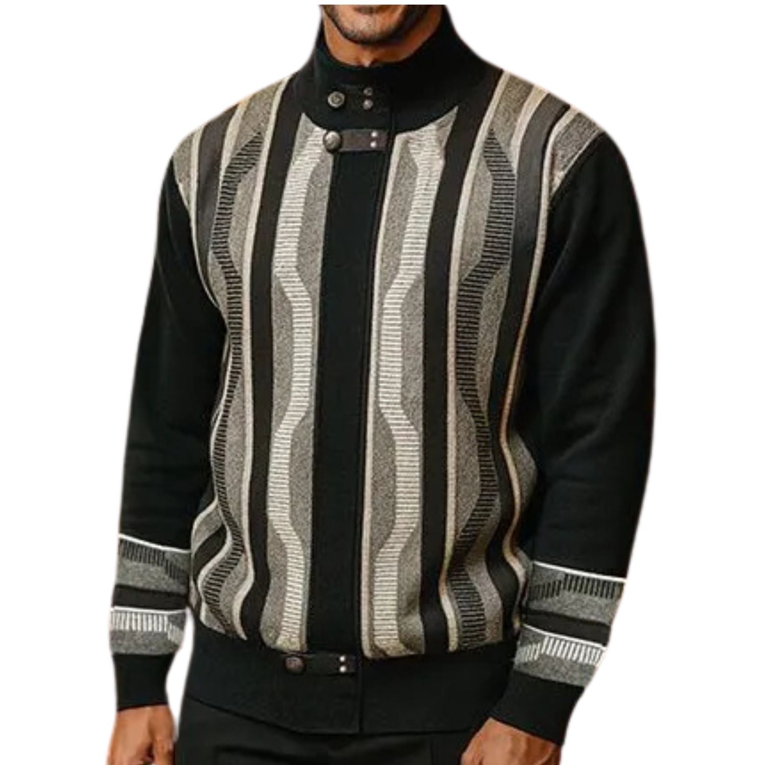 This sweater blends a structured style with standout detailing. Featuring a full zip front, high collar with button-tab accents, and bold vertical geometric patterns, it brings sharp structure to your casual rotation. The ribbed cuffs and hem keep the fit secure while the front pattern adds visual depth. Dress it up with slacks or keep it casual with jeans—this one’s made to do both.