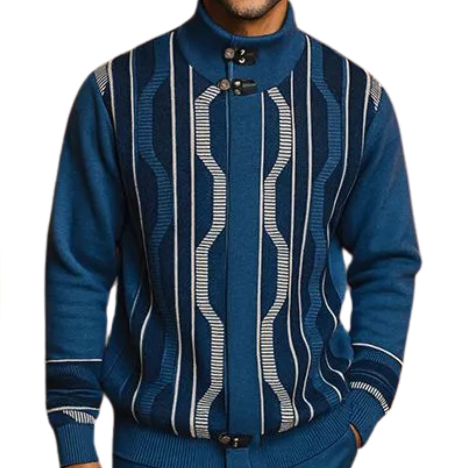 This sweater blends a structured style with standout detailing. Featuring a full zip front, high collar with button-tab accents, and bold vertical geometric patterns, it brings sharp structure to your casual rotation. The ribbed cuffs and hem keep the fit secure while the front pattern adds visual depth. Dress it up with slacks or keep it casual with jeans—this one’s made to do both.