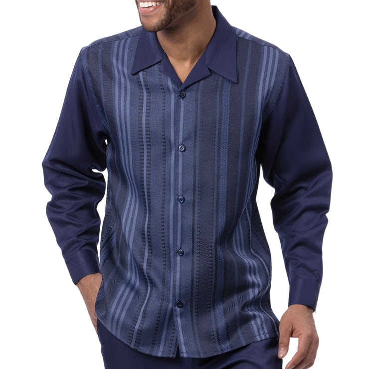 Long sleeve shirt with vertical woven stripe texture and open collar, paired with solid flat-front pants in matching navy. Regular fit for easy wear.