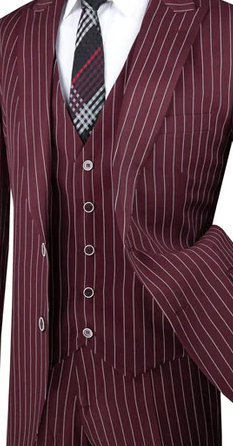 Step into a world of luxury with our Burgundy Pinstripe 3 Piece Vested Suit from the Suitania Collection. This single-breasted suit, adorned with a peak lapel, epitomizes sophistication with a hint of daring. Comprising a 2-button jacket, a matching 5-button vest, and flat front pants, it offers a regular fit for the modern gentleman. The luxurious wool feel combined with the distinctive gangster stripe makes this ensemble a must-have for those looking to make a statement. Additionally, enjoy the complimentary set of solid buttons housed in the chest pocket, adding a unique touch to your attire.