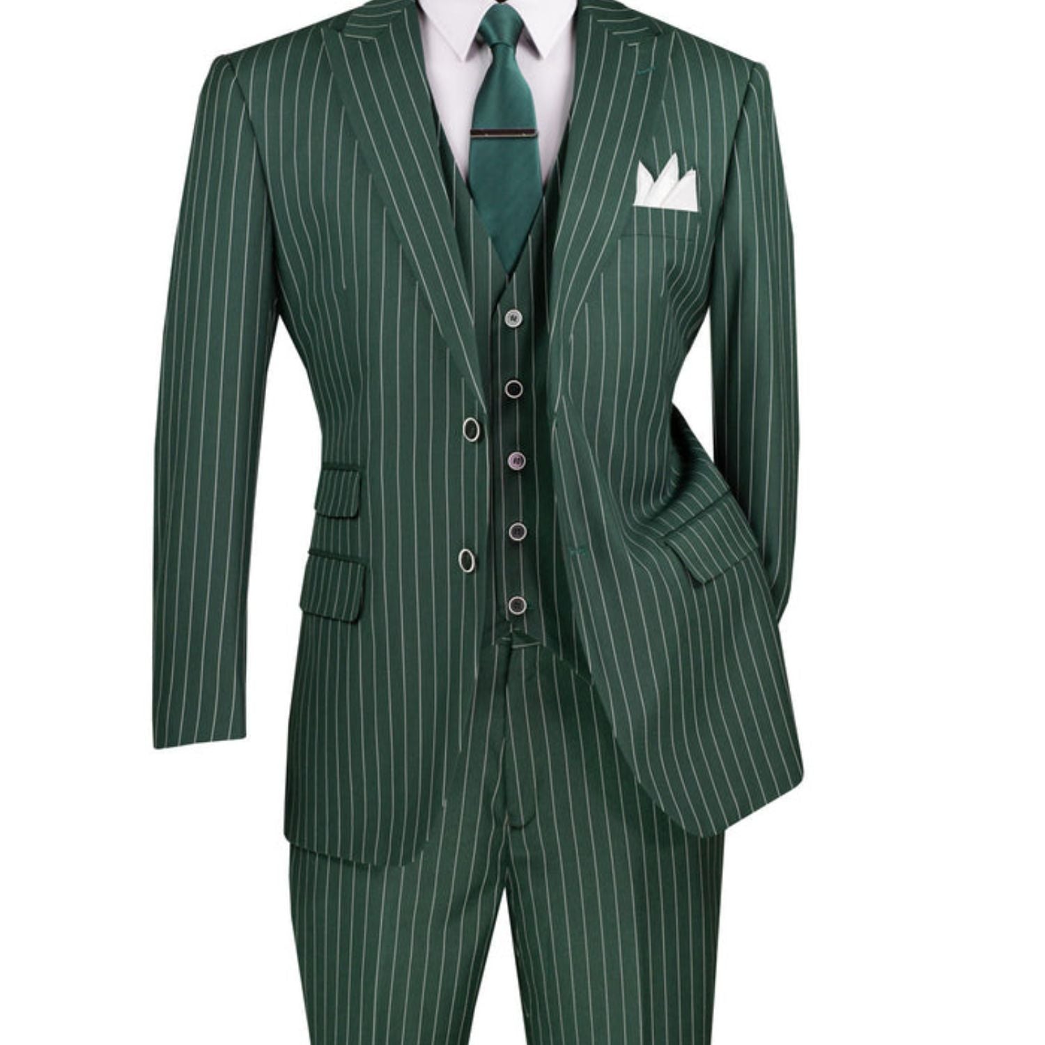 Welcome a symphony of style and comfort with the Suitania Collection's Hunter Green Pinstripe 3 Piece Vested Suit. This striking ensemble, crafted with a luxurious wool feel, promises a regular fit that resonates well with modern fashionistas. The single-breasted 2-button jacket pairs perfectly with a peak lapel, adding a dash of sophistication to your attire. The set includes a matching 5-button vest and flat-front pants, showcasing a bold gangster stripe that speaks volumes about your style. Plus, enjoy a complimentary set of solid buttons nestled in the chest pocket, enhancing your sartorial elegance.