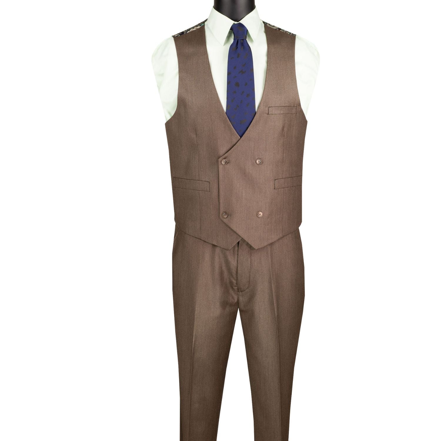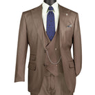 Three-piece suit in a deep taupe sharkskin weave. Single-breasted 2-button jacket with side vents, matching vest, and flat front pants with an adjustable waistband. Fancy lining and a built-in pocket square design complete the set.