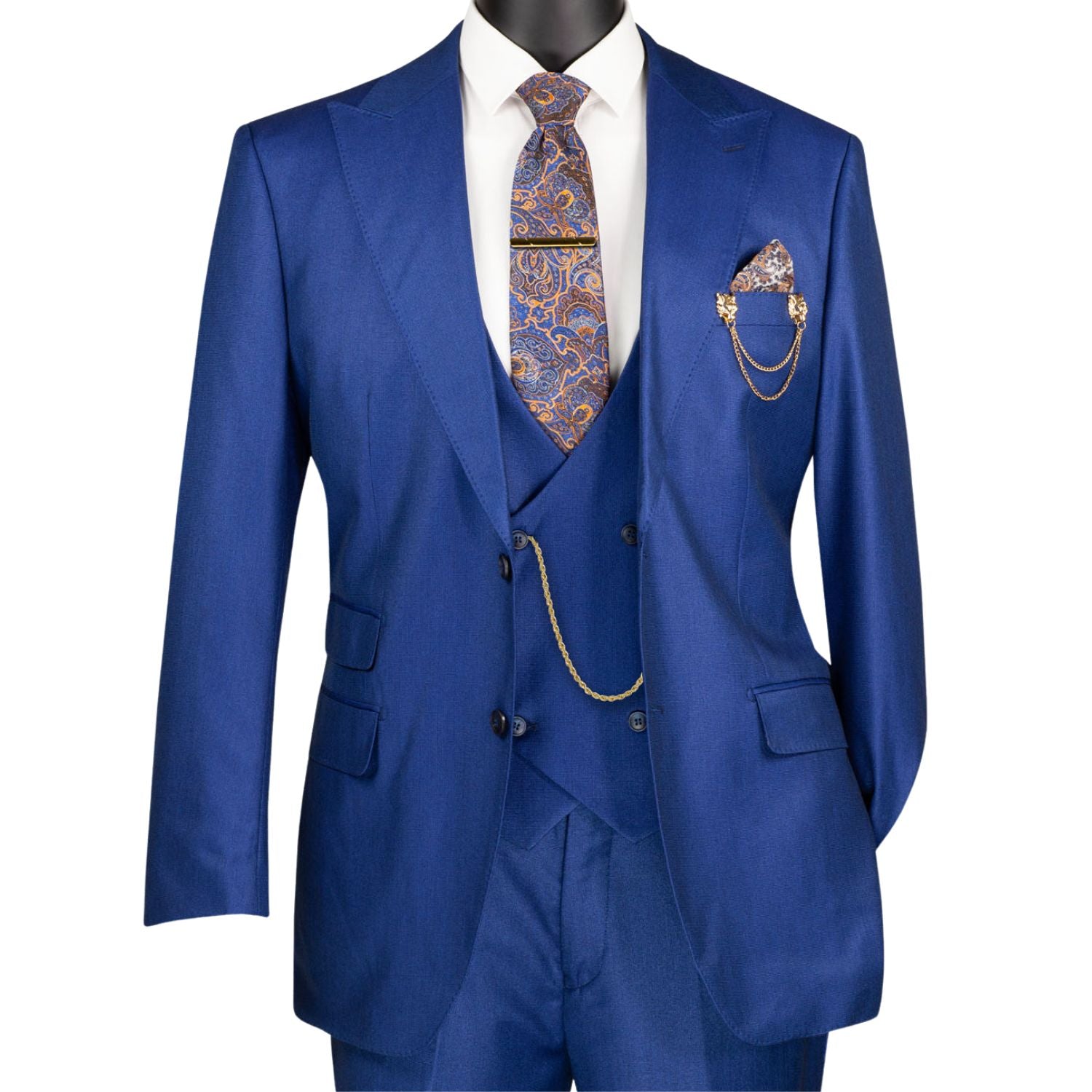 Three-piece suit in a estate blue sharkskin weave. Single-breasted 2-button jacket with side vents, matching vest, and flat front pants with an adjustable waistband. Fancy lining and a built-in pocket square design complete the set.