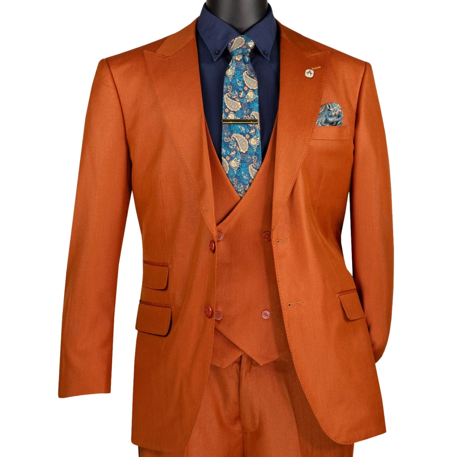 Three-piece suit in a rust sharkskin weave. Single-breasted 2-button jacket with side vents, matching vest, and flat front pants with an adjustable waistband. Fancy lining and a built-in pocket square design complete the set.