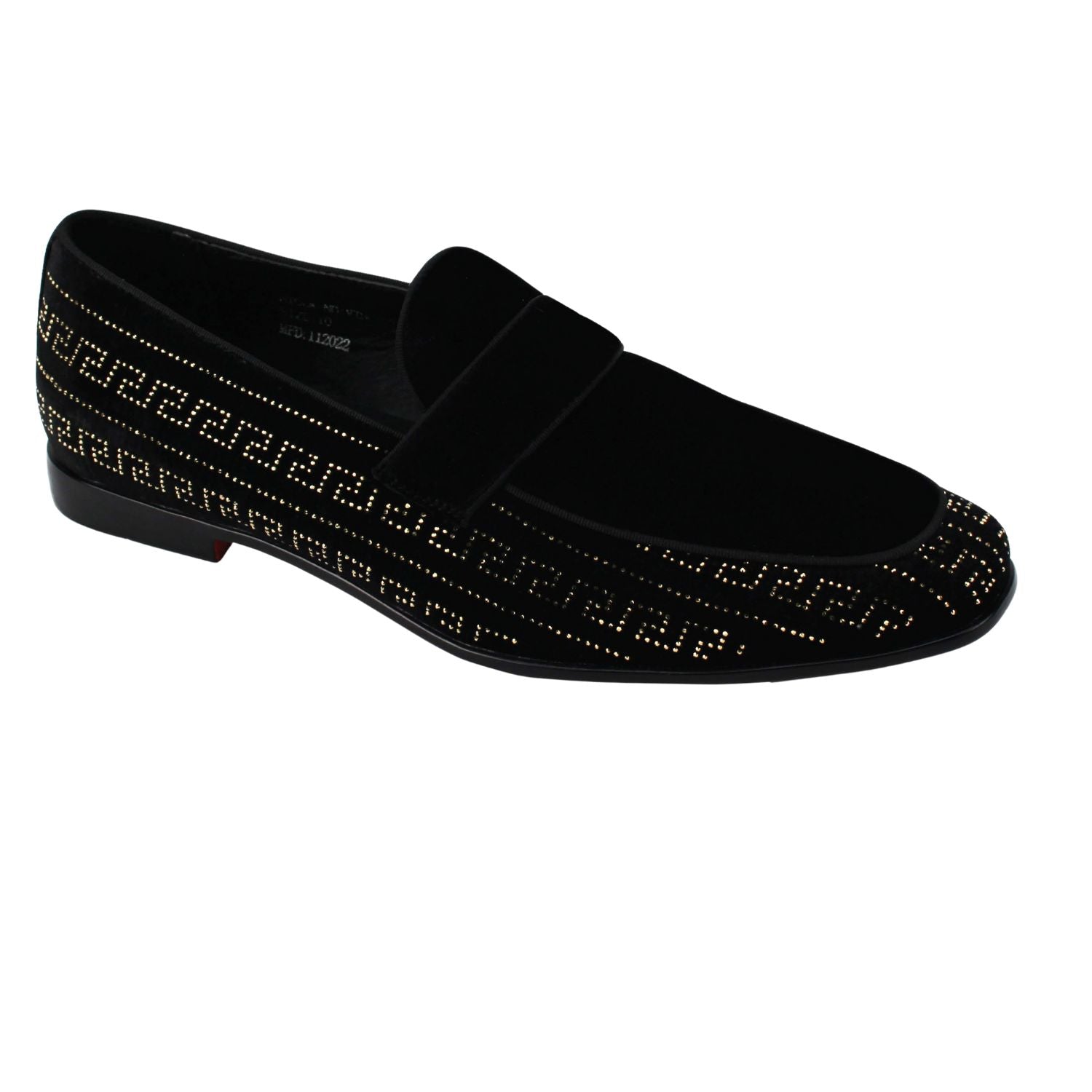 A bold, clean-cut loafer that brings sparkle without trying too hard. These moc toe smoking shoes feature a sharp geometric studded pattern over soft velour and come in three crisp finishes: Black/Silver, Black/Gold, and classic Black. Perfect for formal events or an upscale night out, they blend texture and shine with ease.