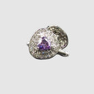 - Gemstones: Central teardrop-shaped amethyst surrounded by a halo of small diamonds