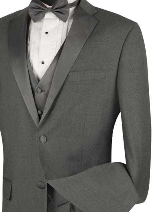 - 4-piece tuxedo set with a jacket, vest, bow tie, and flat-front pants
