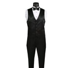 - 4-piece tuxedo set with a jacket, vest, bow tie, and flat-front pants with adjustable waistband