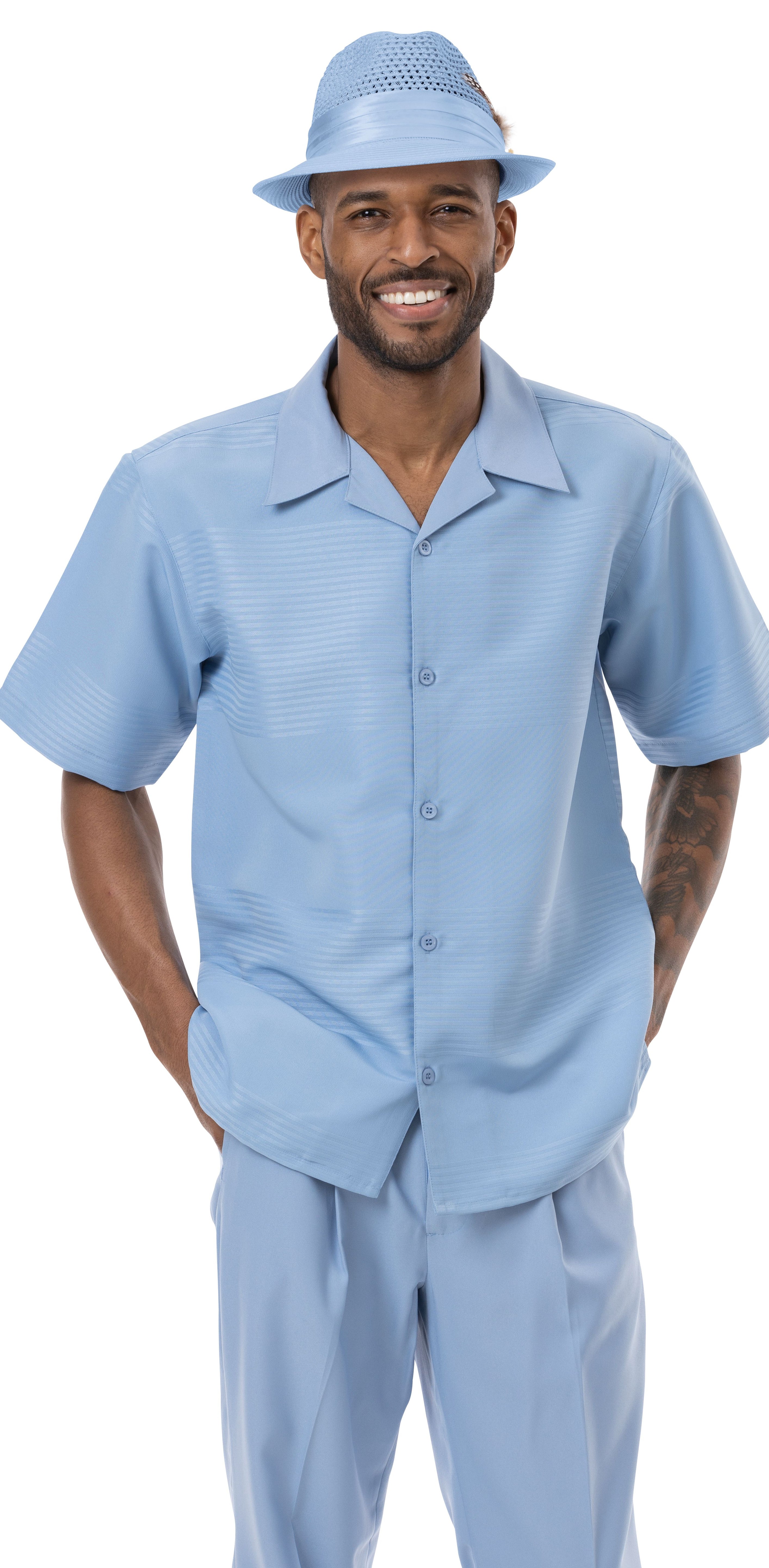 Get up and get going with this comfortable, stylish walking suit. Whether you're hitting the town or taking a leisurely stroll, this two piece set is perfect for any spring or summer occasion. With horizontal stripes and an open collar, this refined polyester suit is sure to turn heads. So grab your hat and sunglasses, and get ready to enjoy the day in style with the Tone on Tone Walking Suit.