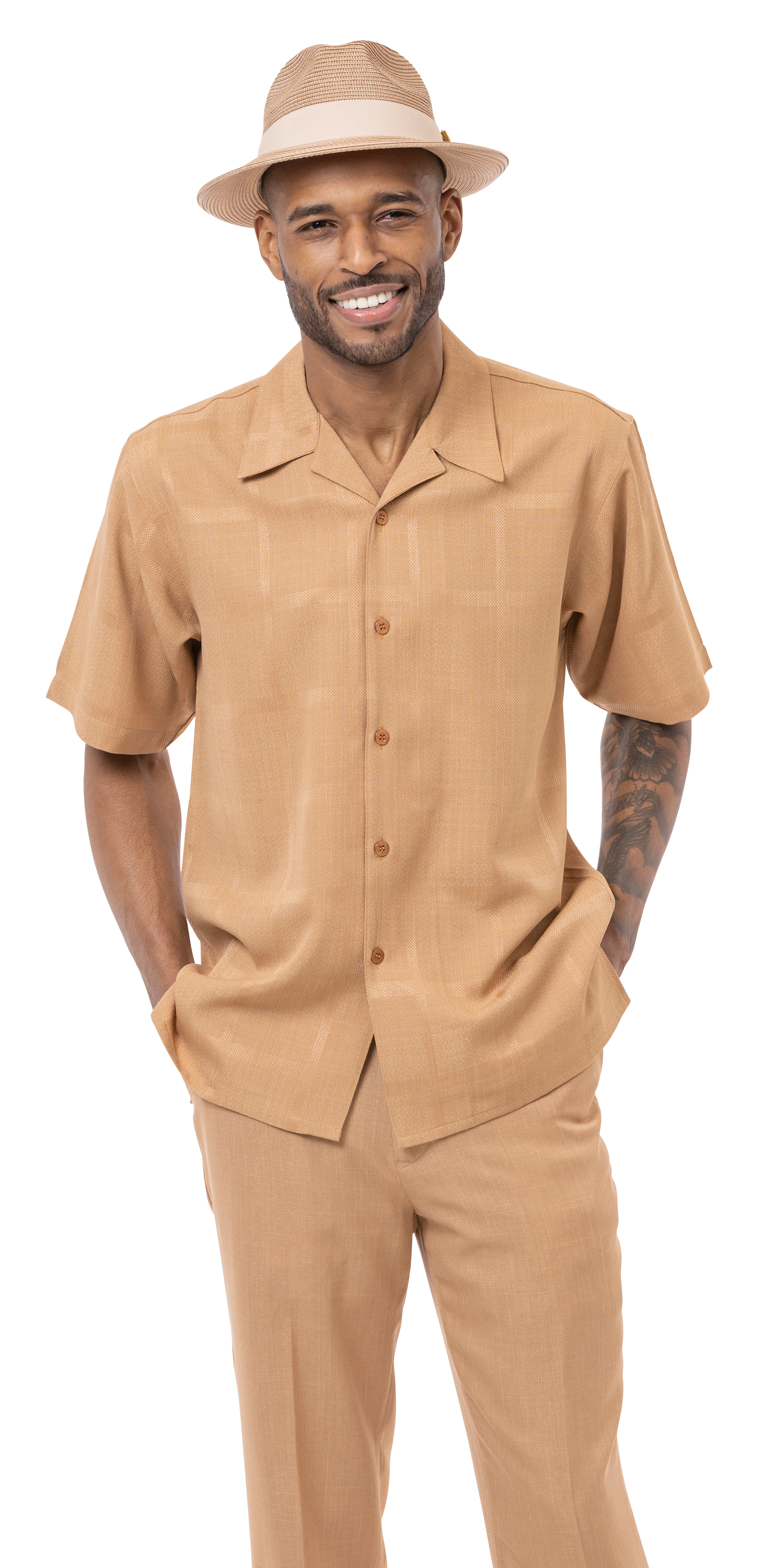 Tone On Tone Tan Windowpane Pattern Walking Suit 2 Piece Short Sleeve Set 2210